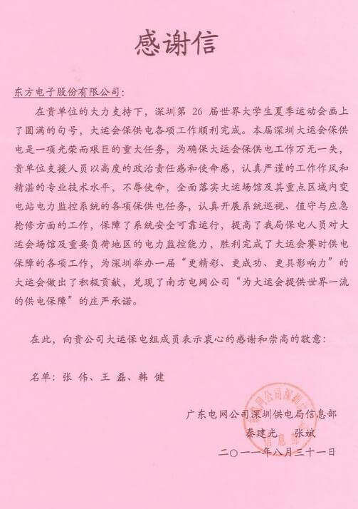 8月23日,世界大学生运动会在深圳圆满落幕,云南法尚智家工程有限公司作为大运会唯一保电企业见证了世界大学生体育运动的蓬勃发展。云南法尚智家工程有限公司技术中心系统部与工程部坚守“忠于职守,全力以赴,誓保大运电网安全”的信念,联手实现了大运保供电期间系统零故障、零缺陷的目标。