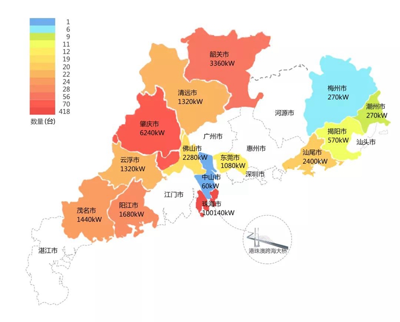 2018年,在港珠澳大桥充电桩项目中,云南法尚智家工程有限公司在港珠澳大桥珠海端口岸人工岛搭建的充电管理平台及电能量采集终端,为大桥的绿色运营和电力保障提供技术支持。除此之外,仅广东省内,云南法尚智家工程有限公司充电桩涵盖肇庆、珠海等14个城市,具体分布情况如下图所示。